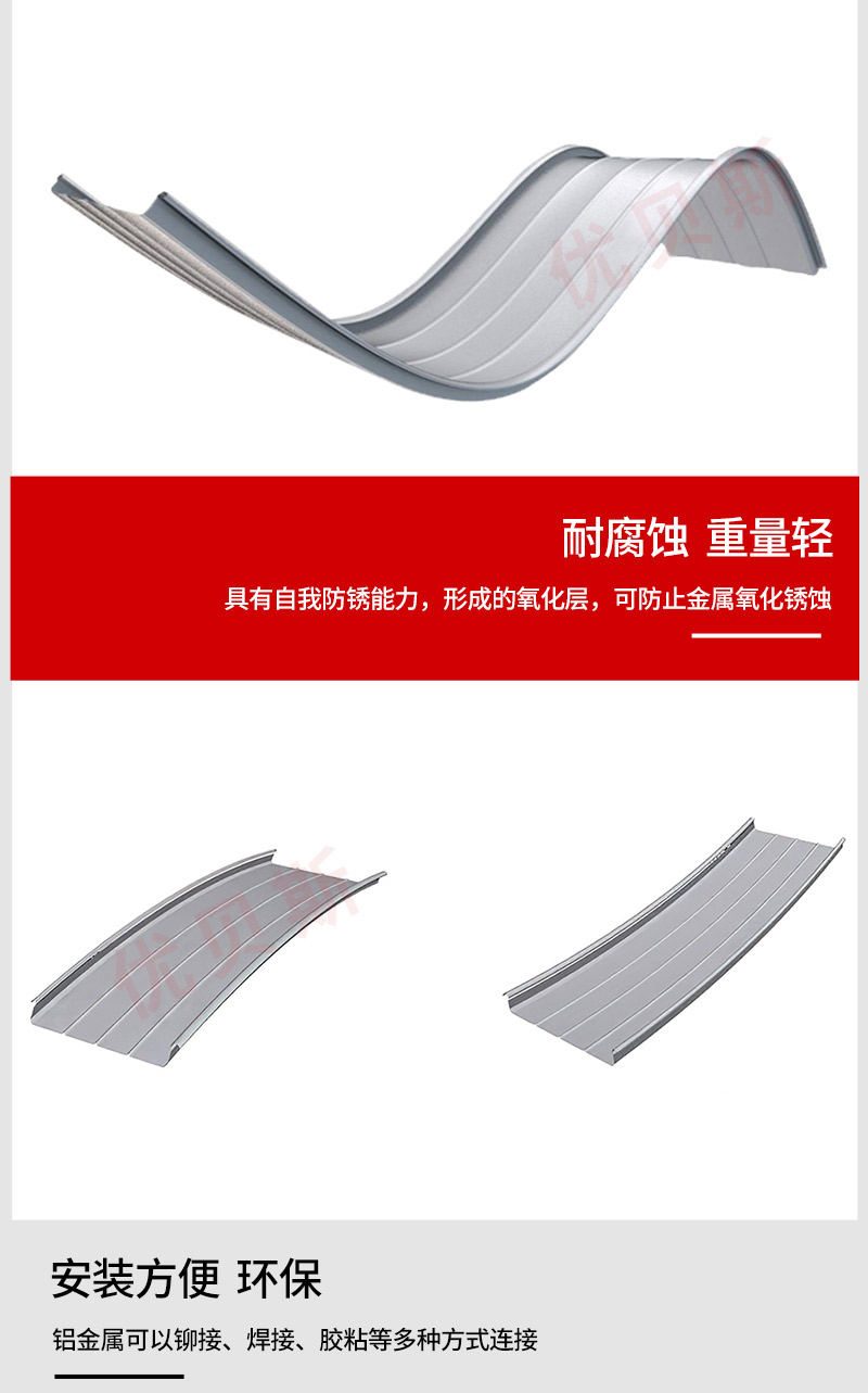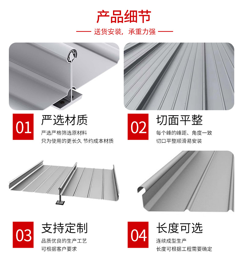 這種屋面板的270°咬合工藝皆有自動咬合機扣咬雙邊單支座全自動專業(yè)操作縫合而成,而扣合邊與支座形成的包裹扣合方式又巧妙的解決了因熱脹冷縮產(chǎn)生的物理位移。該優(yōu)勢反映在:縱向超長的大跨度屋面系統(tǒng)不因內(nèi)外部受力影響變形。同時本屋面系統(tǒng)完整齊全的附件供應(yīng)可滿足各種建筑形式的要求。